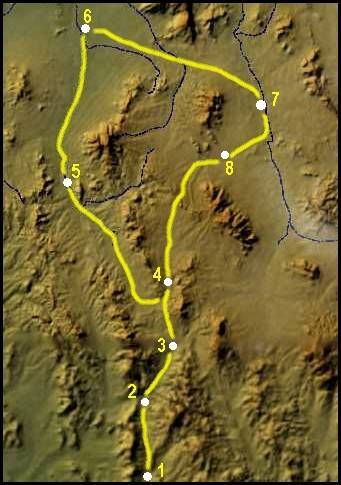 Dolores (1), Imuris (2), Cíbuta (3), Búsanic (4),Merced del Batki (5), San Pedro (6), Gila Mountains to view the Gulf (7), Las Sandías (8), Dionisio {Yuma] (9), Sonoita (10), Caborca (11), Tubutama (12), Magdalena (13), Dolores(1).