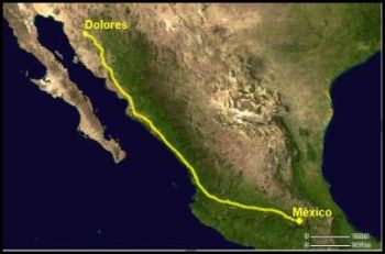 Kino again travels the El Camino Real Occidental to Mexico City from Mission Dolores on November 16, 1697 to January 8 to appear before the highest officials of New Spain to secure peace in the Pimería Alta, to prevent the missions from closing and to advocate for the Jesuit return to Baja. Kino's return trip from Mexico City begins on February 8, 1696 and he arrives in Dolores in mid May, 1696 via the El Camino Real Occidental. See trips descriptiion for 1697 to 1698 below.