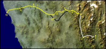 Caborca (1), Arivaipa (2), Quitovac (3), Sonoita (4), Basoitutcan (5), Tupo (6), Ojitos (7), Pinacate Summit to view Gulf (8), Kino Return after (8): Merced (9), Bac (10), Tubutama (11), Magdalena(12), Dolores(13). Salavatierra return after (8): Sonoita (4), Quitovac (3), Arivaipa (2), Caborca (1), Magdalena (12).