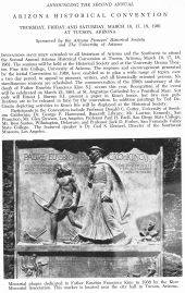 The paper "Kino: Historian's Historian" was presented by Fr. Ernest J. Burrus, S.J. at the Second Annual Arizona Historical Conference that was jointly sponsored by the University of Arizona and the Arizona Pioneers' Historical Society in March 1961. Also in commemoration of the 250th Anniversary of the death of Father Kino that March, two publications were released in Kino's honor and the paintings of Ted DeGrazia depicting Kino's life were displayed at the historical conference.
